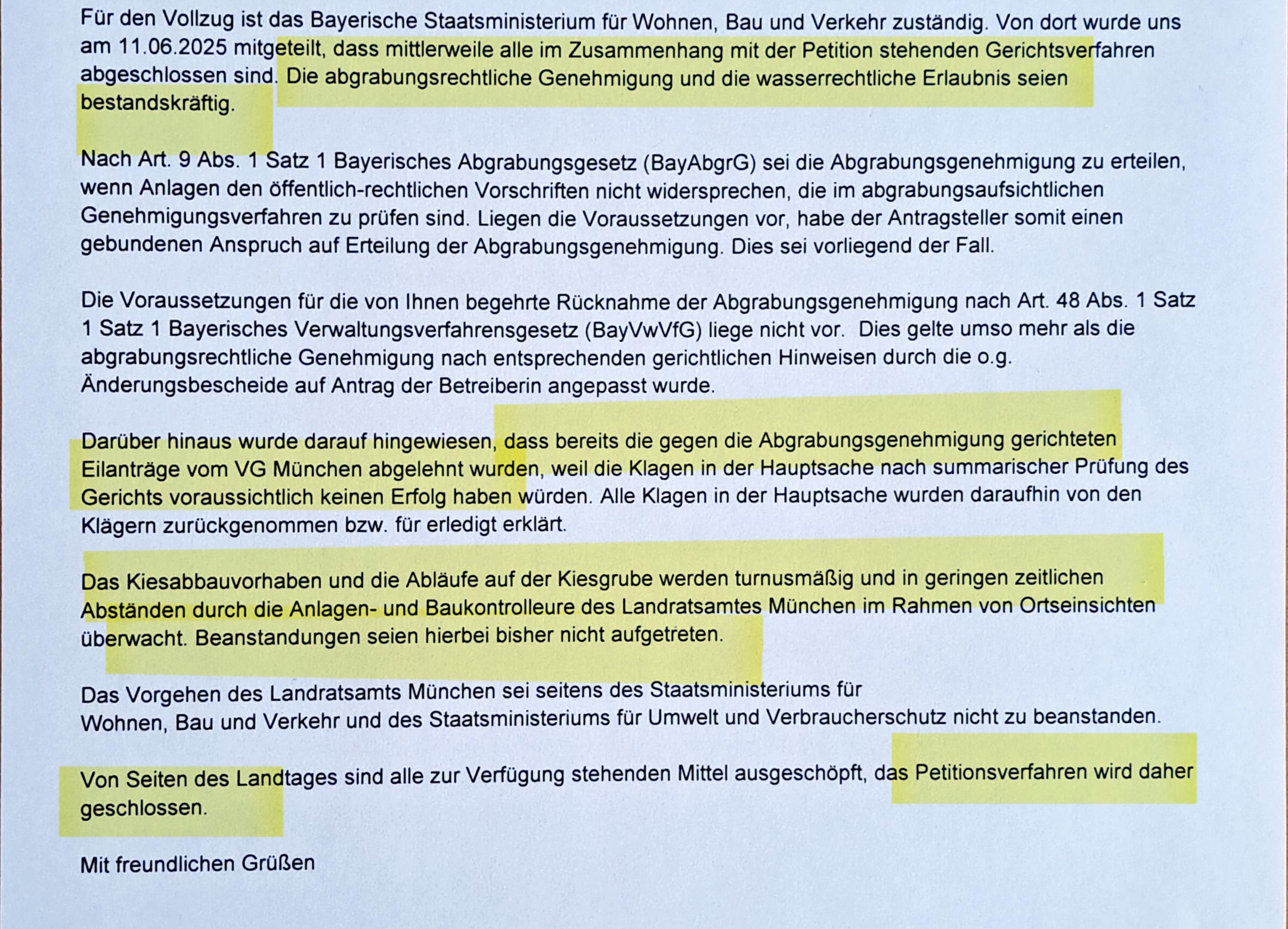 Nachdem ja viele von Ihnen im Herbst 2022 die Petition gegen den Kiesabbau unterstützt haben, hier nun der endgültige Ablehnungsbescheid vom Bayerischen Staatsministerium, den ich Ihnen nicht vorenthalten möchte.
